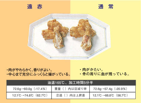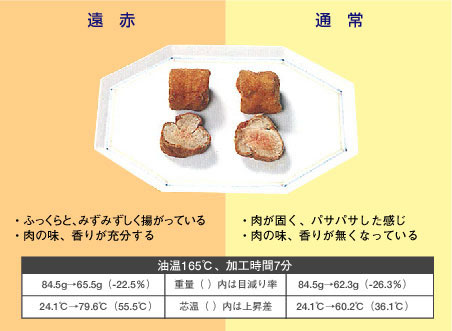 油切れが抜群に良く、衣ムラなくカラッと揚がります。これは、遠赤外線による効率的な放射加熱が面的に平均して行われるからです。そのため、被加熱物質の温度上昇が平均化され、部分的な温度上昇がなくなり、ムラのない美しさが、「外見の差」となってあらわれてきます。 |