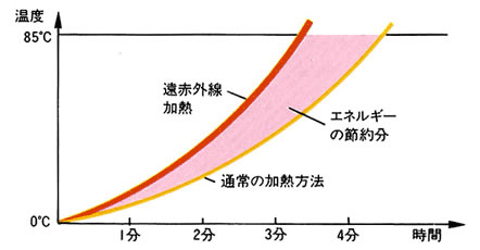 立ち上がり温度の早いことも、遠赤外線の特徴のひとつ。従来のフライヤーとの、その加熱時間のスピード差はかなり幅があります。これは、燃費の節約で最も効果的なウォームアップ時間を縮め、実稼動時間を伸ばし、合せてコスト削減というメリットにつながります。 |